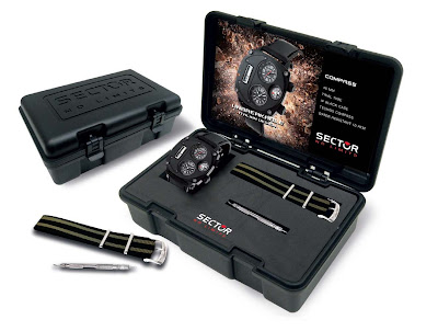 Sector Compass II Trial Time. Calibre de quartzo, muli-funções, com triplo fuso horário e bússola, estanque até 100 metros. Vem numa caixa especial, com uma bracelete suplente. PVP: 289 €