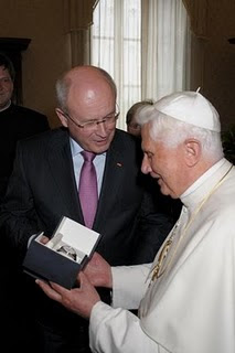 Em cima, o relógio Junghans que foi oferecido ao alemão Joseph Aloisius Ratzinger, hoje Papa resignatário Bento XVI. No seu livro "Luz do Mundo", Ratzinger dizia que usava um Junghans, oferecido há muitos anos pela irmã. Meses depois de o livro sair, a Junghans ofereceu-lhe outro relógio, um Erhard Junghans Tempus Automatic. Com caixa em aço, de 42 mm, o relógio tem calibre automático, com decoração Côtes de Genève.